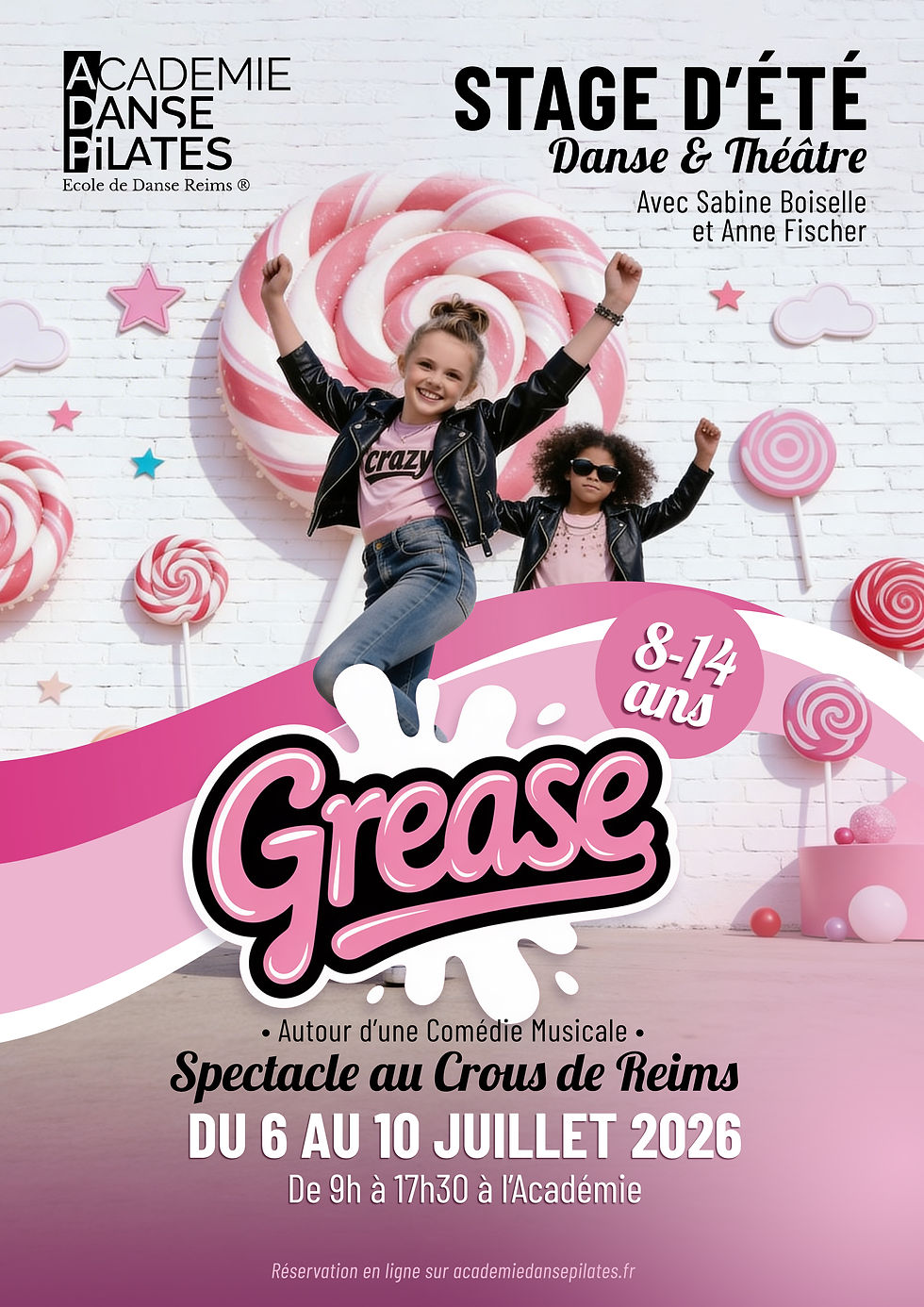 ⭐️ Du 6 au 10 juillet 2026, de 9h à 17h30, à l’Académie Danse Pilates de Reims, les enfants de 8 à 14 ans plongent dans l’univers de la comédie musicale Grease, accompagnés par Sabine Boiselle et Anne Fischer.